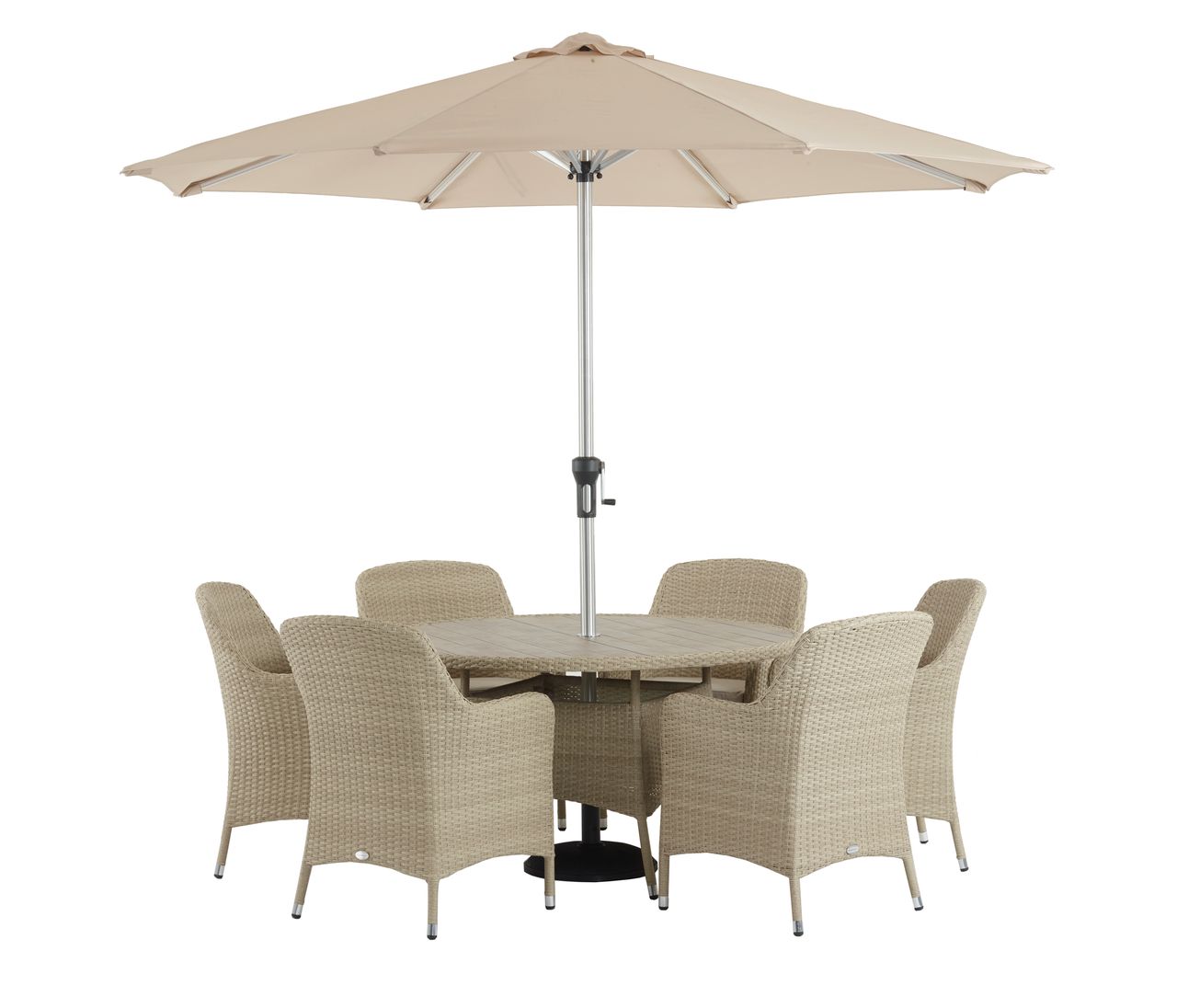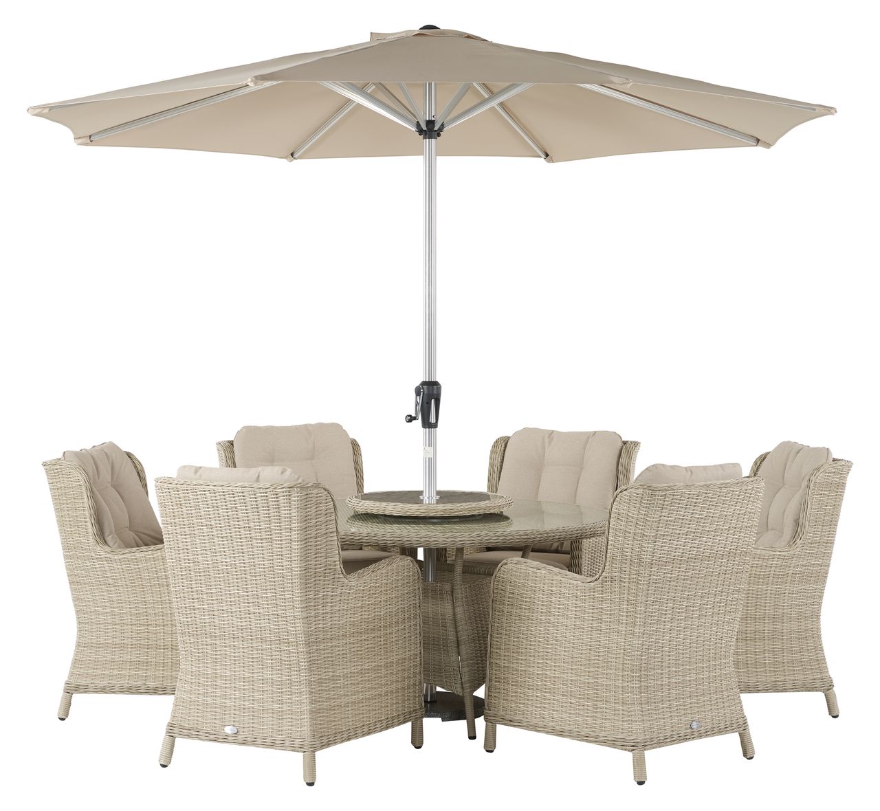 BRAMBLE CREST TRURO 140CM ROUND TABLE, LAZY SUSAN, 6 H/B ARMCHAIRS, PARASOL & BASE- SANDSTONE
