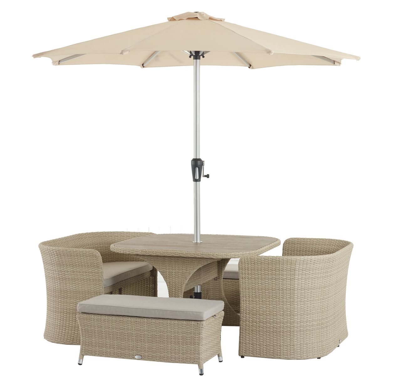 BRAMBLE CREST FALMOUTH 120CM TABLE, 4 H/B ARMCHAIRS, PARASOL & GRANITE BASE - SANDSTONE